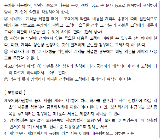 6 가령「...에 관한 사항은 산출방법서에 정한 바에 따릅니다.」 등의 문언을 말하며, 사업방법서도 같은 방법으로 편입시킬 수도 있을 것이다. 물론 이 경우 그 특정사항이 보험계약의 내용을 이루게 되는 이유는 산출방법서나 사업방법서 자체의 사법적 효력 때문이 아니라 약관의 조항을 통하여 약관의 내용으로 편입되었기 때문이다. 다만 약관조항을 통하여 일정한 사항을 산출방법서 등에 위임하는 것은 약관에 대한 가독성을 저해하는 등 많은 문제가 내포되어 있기 때문에 바람직한 것은 아니라고 하겠다.