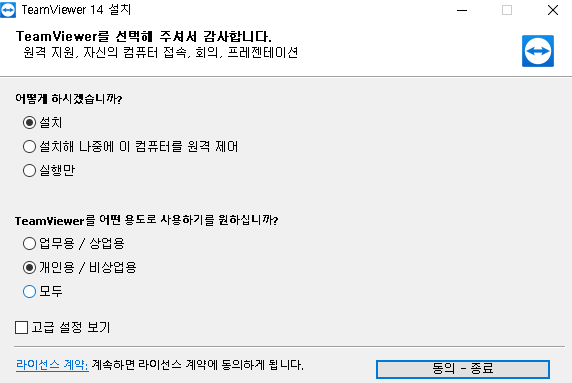 원격제어 하는 사람은 [설치] - [개인용/비상업용]으로 설치