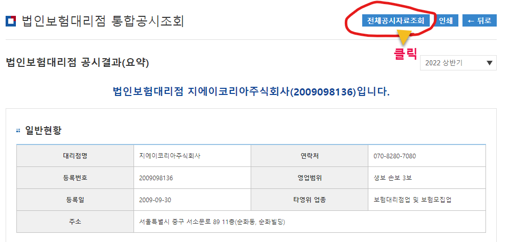 법인대리점 통합공시조회에서 전체공시자료 조회 클릭