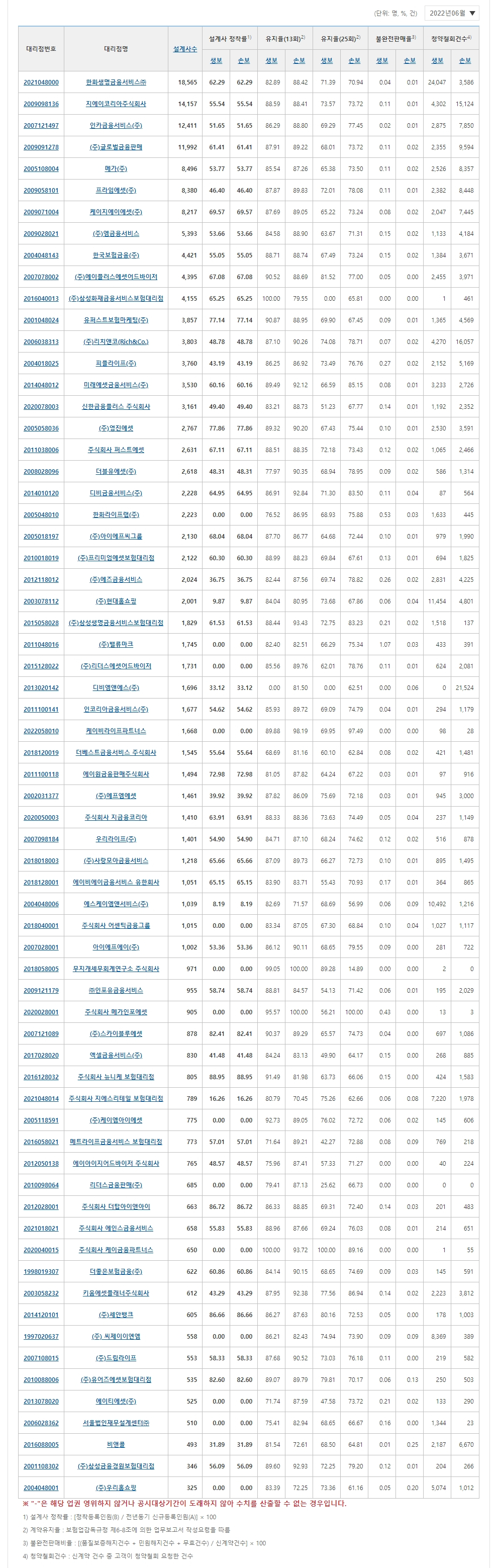 설계사 정착률 - 고아계약이 많은지 여부를 알 수 있습니다.