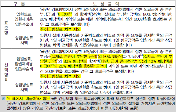 ③ 피보험자가 국민건강보험법 또는 의료급여법을 적용받지 못하는 경우에는 입원의료비(「국민건강보험요양급여의 기준에 관한 규칙」에 따라 보건복지부장관이 정한 급여 및 비급여의료비 항목에 한합니다)중 본인이 실제로 부담한 금액의 40% 해당액을 하나의 질병당 보험가입금액(5,000만원을 최고한도로 계약자가 정하는 금액으로 합니다)을 한도로 보상합니다.