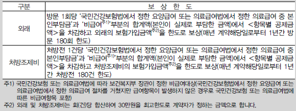 ① 회사는 피보험자가 질병으로 인하여 병원에 통원하여 치료를 받거나 처방조제를 받은 경우에는 통원의료비로서 매년 계약해당일로부터 1년을 단위로 하여 다음과 같이 외래(외래제비용, 외래수술비) 및 처방조제비를 각각 보상합니다.