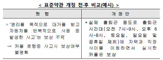 출퇴근 시간대 실제 출퇴근 목적의 유상카풀도 다툼없이 보상가능하도록 규정하여 보장사각지대를 해소