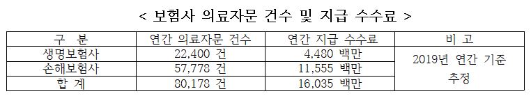 □ 2019년 하반기 보험사 의료자문 현황을 분석한 결과, 보험사들은 연간 8만 건의 소견서를 보험사 자문의에게 의뢰했고, 이들에게 의료자문료 명목으로 연간 160억 원 정도를 지급했다.