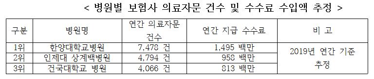 □ 의료자문 건수가 가장 많은 병원은 한양대학교병원으로 모든 생명보험사와 손해보험사의 자문의 노릇을 했고, 연간 7,500여 건이 넘는 소견서를 발급하며 15억 원의 자문료를 받아 챙겼다. 2위는 인제대 상계백병원, 3위는 건국대학교 병원이었다.
