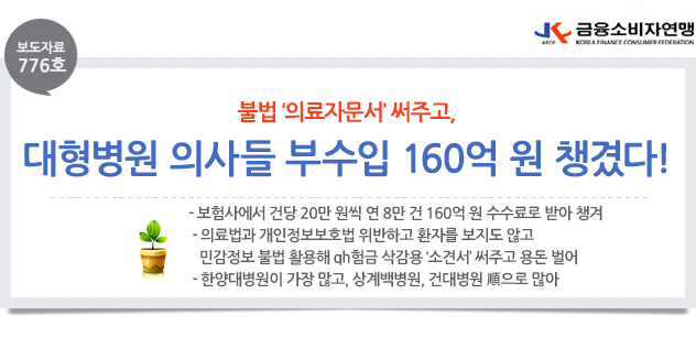 □ 금융소비자연맹(www.kfco.org, 이하 ‘금소연’, 상임대표 조연행 )은 보험회사가 보험금 지급을 거부하거나 삭감하기 위해, 대형병원 소속 의사에게 불법적인 소견서를 연간 8만 건이 넘게 발급받고, 수수료 명목으로 연간 160억 원을 넘는 비용을 지급한 것을 확인했다. 특히, 한양대학교병원 의사들은 연간 3,739건의 소견서를 써주고 15억 원 정도를 자문의 수수료로 챙겨 우리나라 전체 대형병원 중 가장 많은 부수입을 번 것으로 조사됐다.