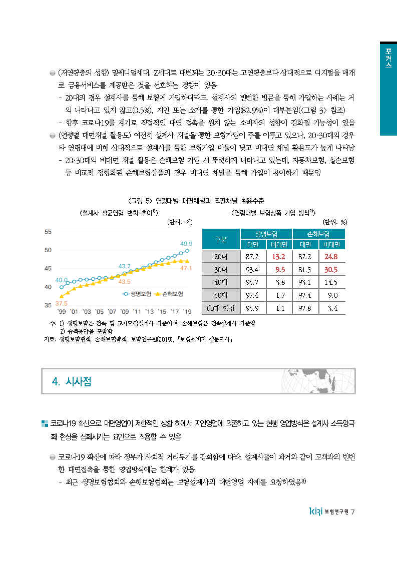 - 설계사 조직의 평균연령7)은 2019년 기준 생명보험과 손해보험 각각 49.9세, 47.1세