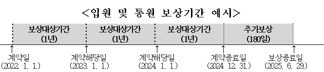 ② 피보험자가 입원하여 치료를 받던 중 보험계약이 종료되더라도 그 계속 중인 입원에 대해서는 다음 예시와 같이 보험계약 종료일 다음날부터 180일까지 보상합니다.