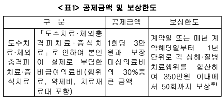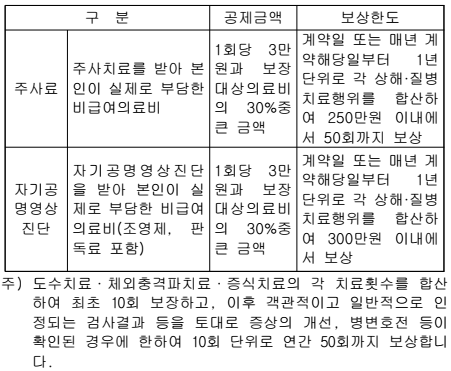 - 의료기관을 1회 통원(또는 1회 입원)하여 치료목적으로 2회 이상 주사치료를 받더라도 1회로 보고 제1항에서 정한 공제금액 및 보상한도를 적용합니다.
