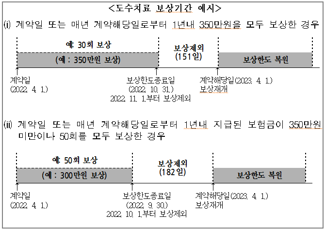 ④ 의료기관을 1회 통원(또는 1회 입원)하여 2종류(회) 이상 치료를 받거나 동일한 치료를 2회 이상 받은 경우는 다음과 같이 1회당 공제금액 및 보상한도를 적용합니다.