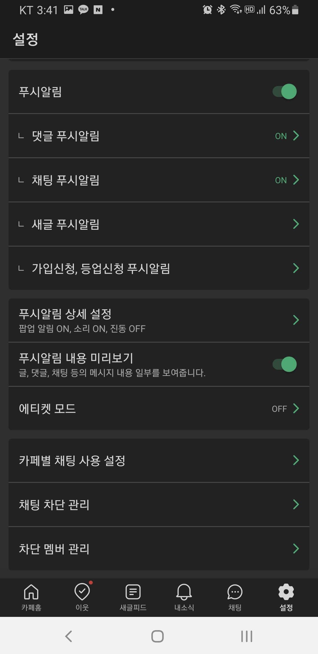 ● 네이버 카페앱 첫 화면 -> 맨 하단 오른쪽 [설정] 클릭