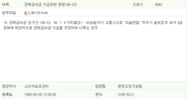 피보험자가 교통사고로 좌측슬관절 장해진단을 받고 상해부위의 강직정도가 심하고 보행시 운동영역이 정상인의 1/2이하로 제한되므로 해당보험약관상 제4급 장해정도인 “한쪽다리의 3대관절중 1관절을 영구히 못쓰는 상태”에 해당한다고 주장함에 대해, 운동제한의 정도가 “완전강직”에 이르러 운동기능을 영구완전상실한 것으로 볼수없다고 판단하여 각하조정 결정을 하다.