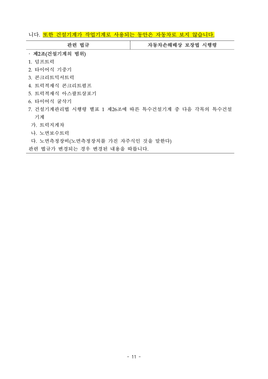 이 사건 약관 제1조(보험금의 지급사유) 제9항에서 “건설기계가 작업기계로 사용 되는 동안은 자동차로 보지 않는다”고 규정하고 있는데, 본건에서 덤프트럭이 작업기 계로 사용되었는지 여부를 판단하기 위해서 덤프트럭이 어떠한 경우에 작업기계로 사 용되는 것인지를 살펴본다.