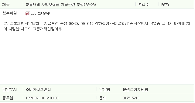 | 제1998-36호] 교통재해 사망보험금 지급관련 분쟁 (0) | 2017.06.16 |